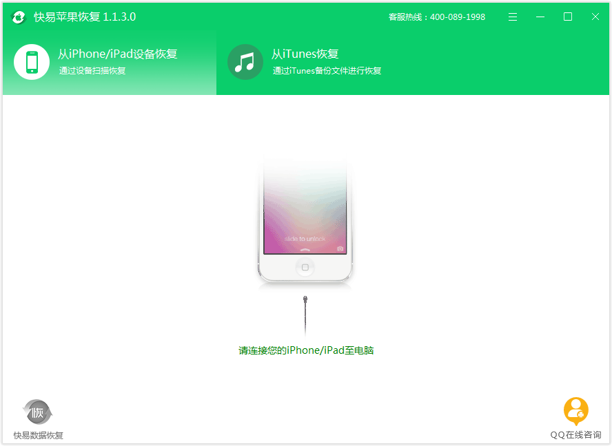 第二步:打开软件“快易苹果恢复”,用USB数据线连接iphone/ipad和电脑,注意请尽量使用标配的USB数据线,劣质的数据线会导致连接不稳定。