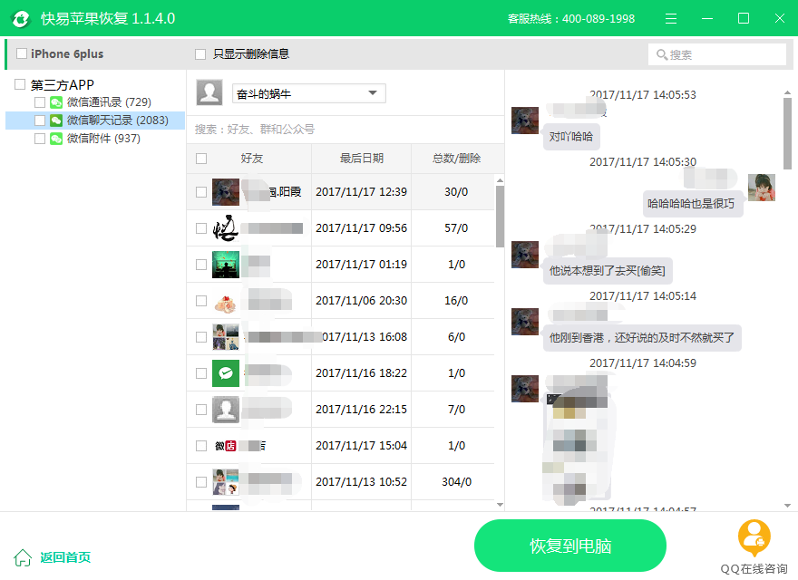 第3步:扫描结束您可以预览数据,预览后,您可以选择需要的聊天记录。然后点击“恢复”按钮恢复数据。