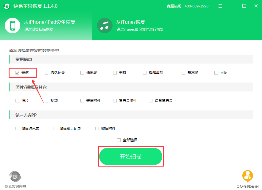 第2步:打开软件,将您的iphone连接到计算机。在数据类型中选择“短信”进入扫描。