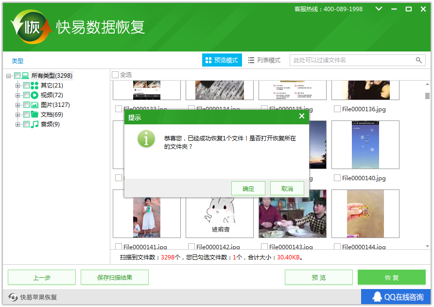 接着文件进入扫描状态,扫描过程中可以点击预览模式,更直观的看到误删除的文件,可以随时点击暂停扫描,点开文件预览看下数据有没有显示完整,再选择最后一步恢复到电脑。