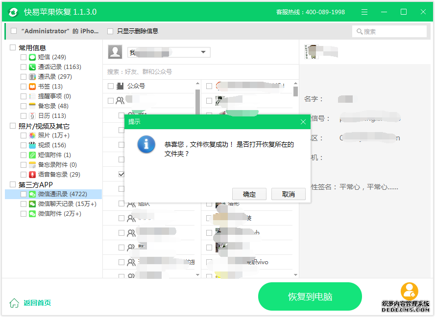 图3:恢复通讯录成功